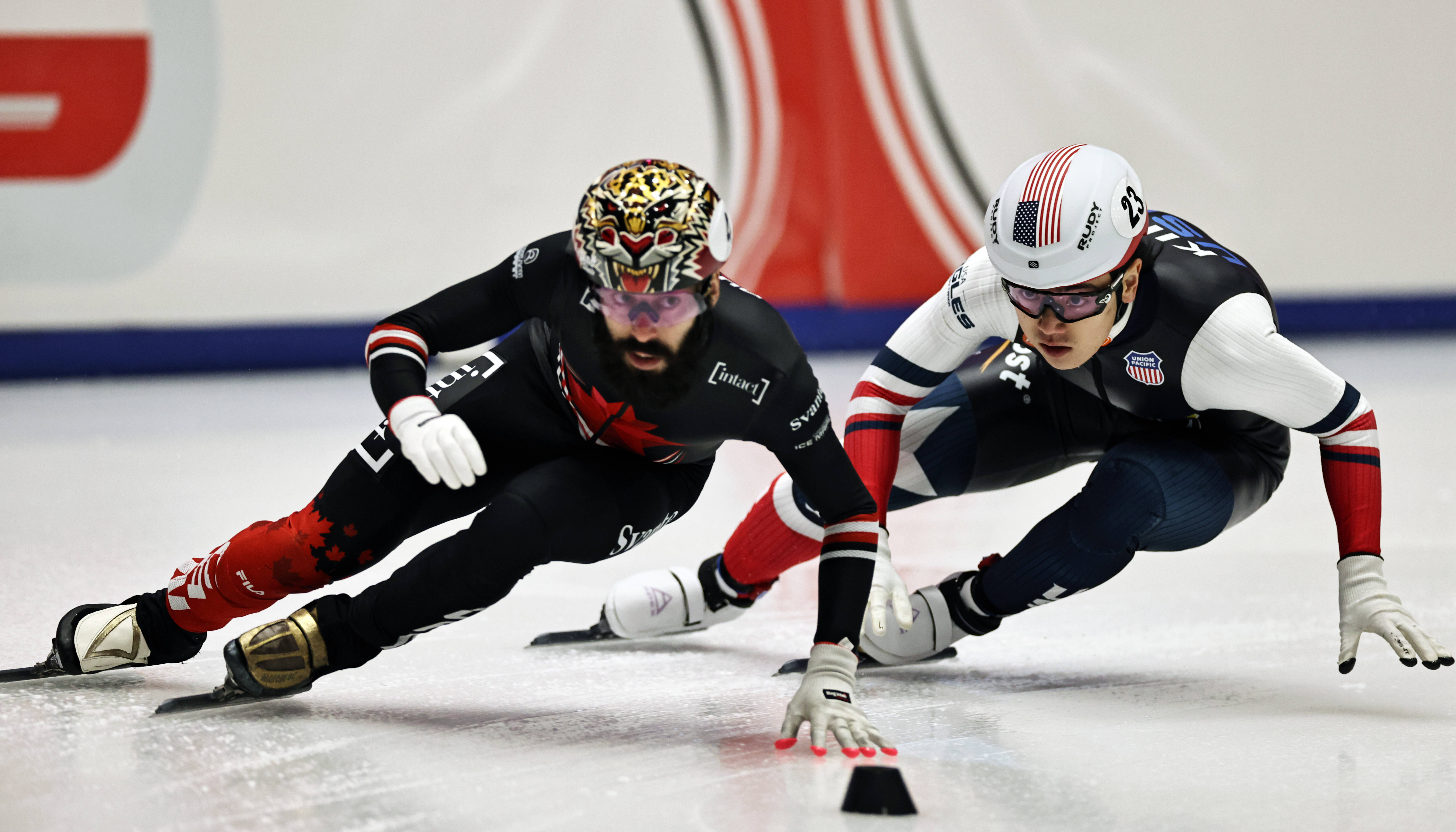 11月20日,加拿大队选手萨罗尔特(右)在比赛中。最终,加拿大队以2分41秒818的成绩晋级半决赛。 新华社记者 高静 摄