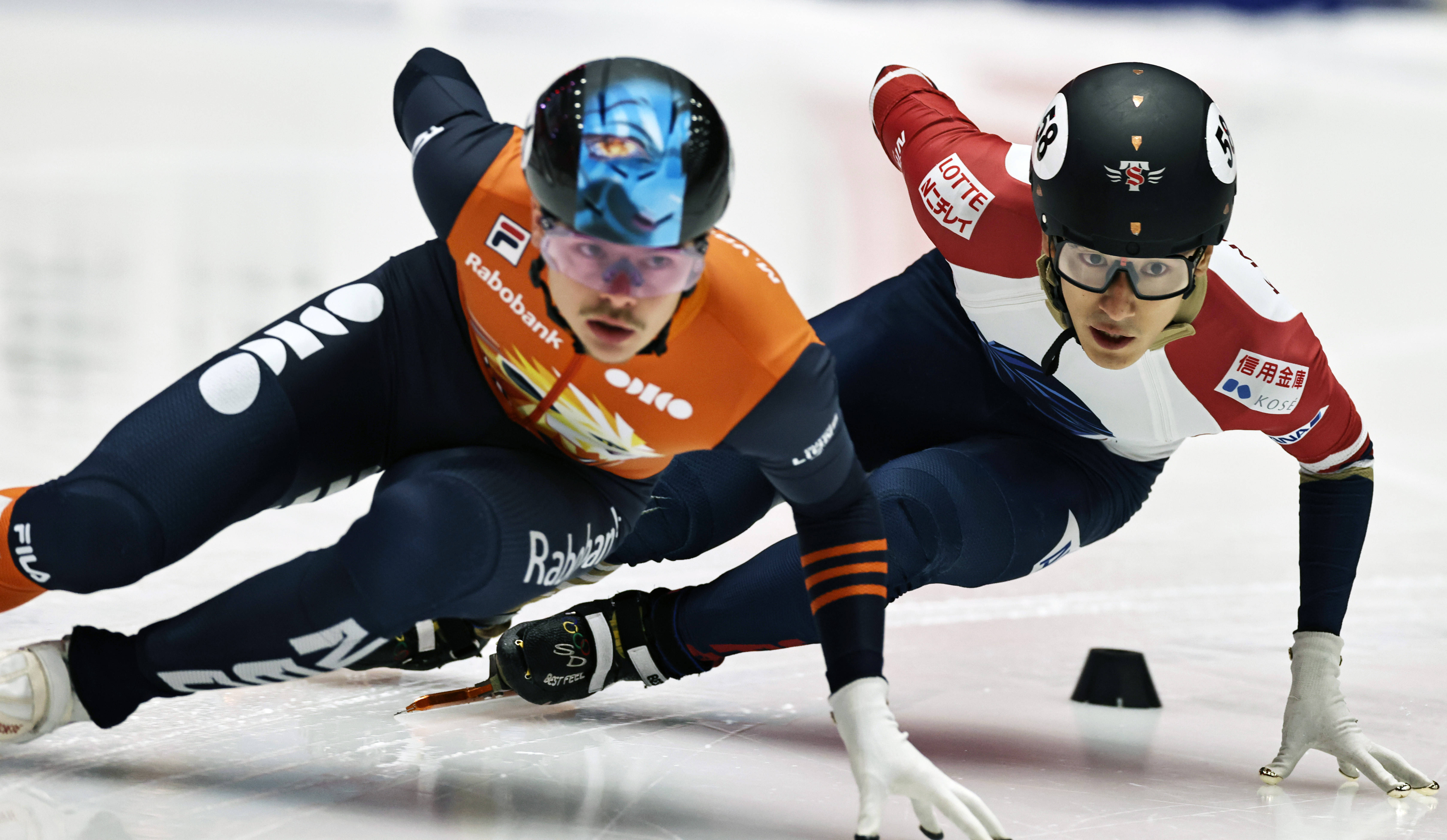 11月20日,韩国队选手申东民(左)在比赛中。最终,韩国队以2分45秒792的成绩晋级半决赛。 新华社记者 高静 摄