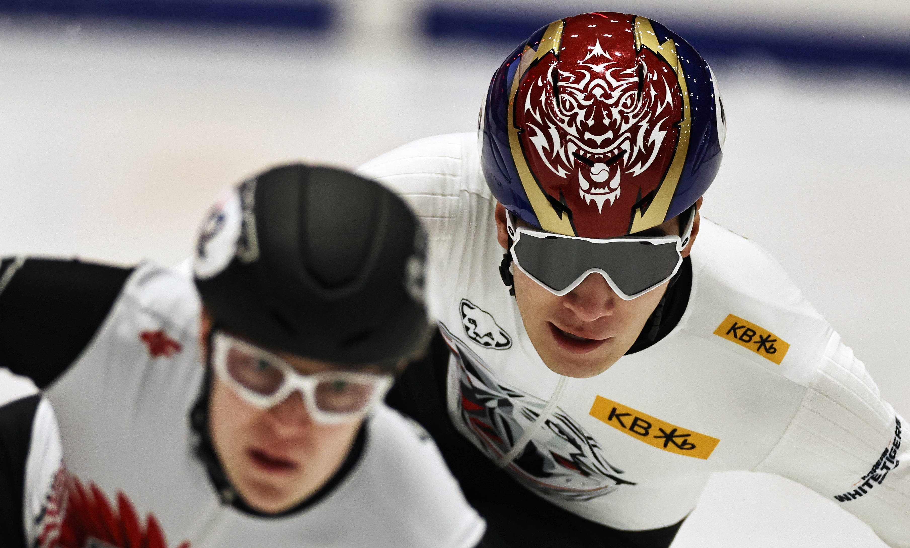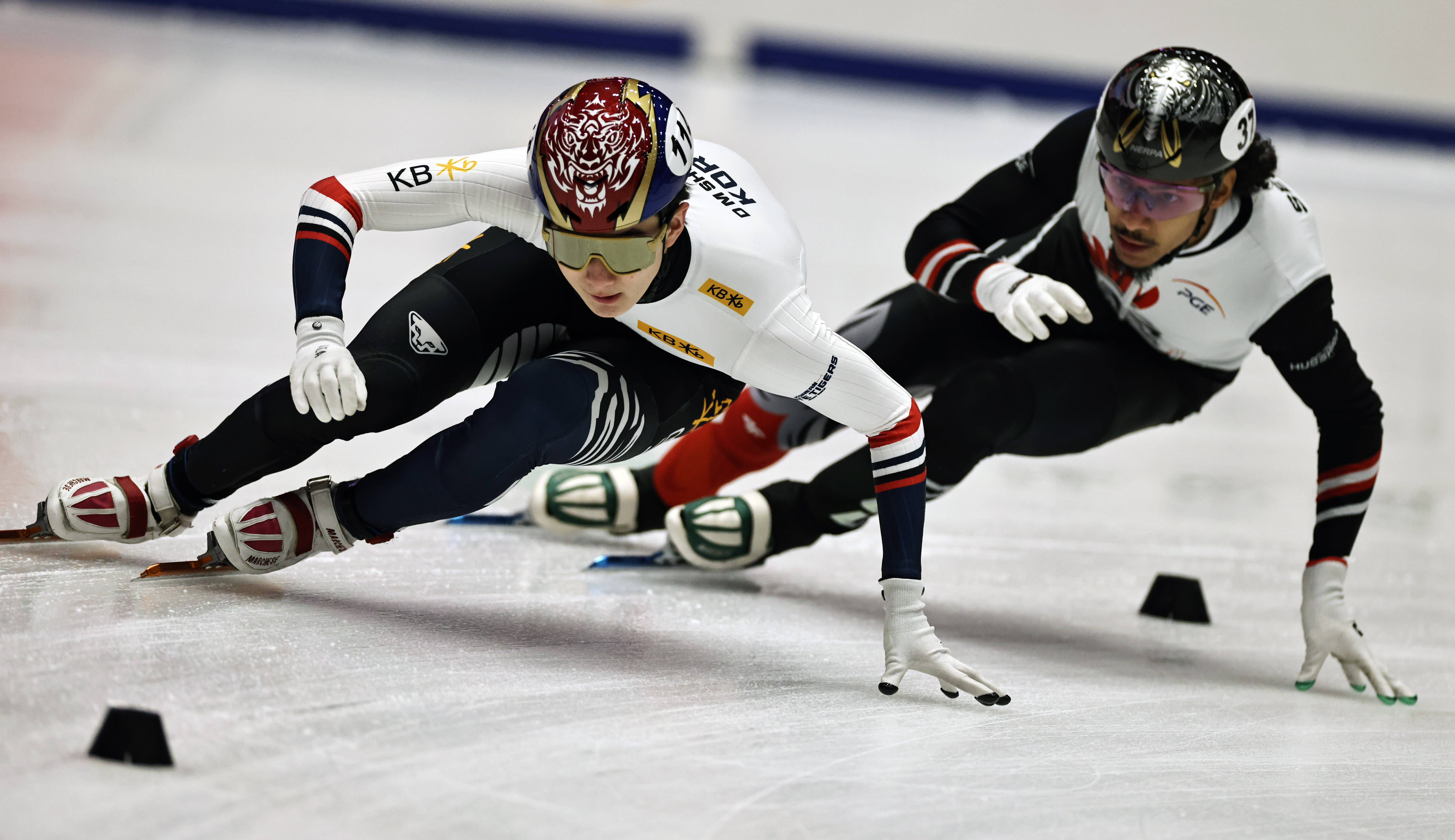 11月20日,韩国队选手黄大宪(右)在比赛中。最终,韩国队以2分45秒792的成绩晋级半决赛。 新华社记者 高静 摄