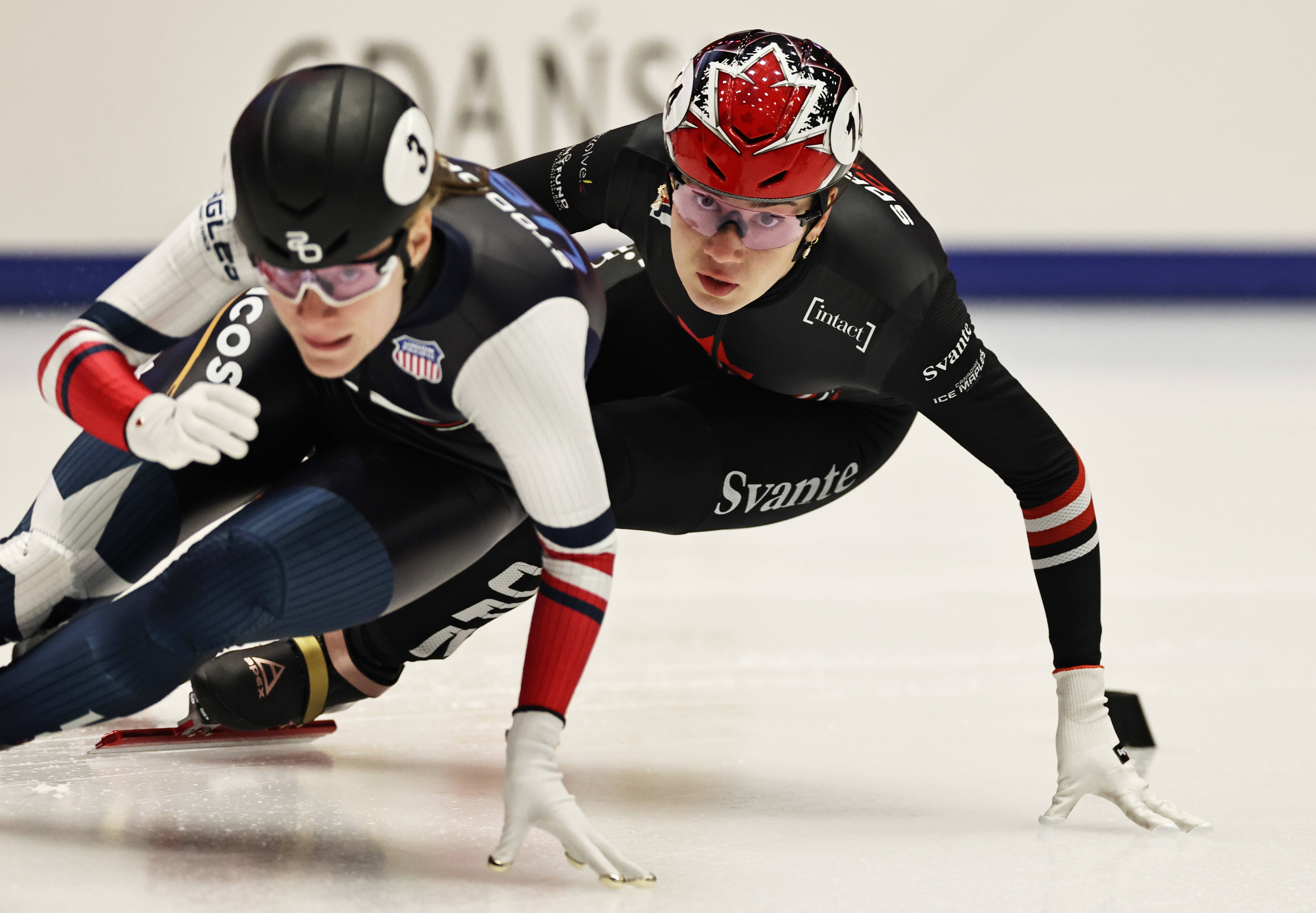 11月20日,加拿大队选手萨罗尔特(右)在比赛中。最终,加拿大队以2分41秒818的成绩晋级半决赛。 新华社记者 高静 摄